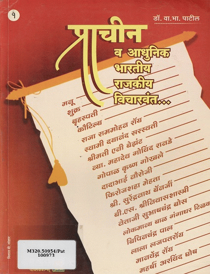 | M320/Cha कौटिलीय अर्थशास्त्र आर्य चाणक्य लिखित : समग्र मराठी भाषांतर | M320.01/Bir राजकीय सिद्धान्त आणि संकल्पना | M320.01/Dev राजकीय संकल्पना आणि सिद्धान्त | M320.50954/Pat प्राचीन व आधुनिक भारतीय राजकीय विचारवंत - भाग 1 | M320.50954/Pat आधुनिक भारतीय राजकीय विचारवंत भाग - २ | M320.55/Mah आर.एस.एस. मोजमाप थोडक्यात | M320.80954/Pat अखिल भारतीय स्थानिक स्वराज्य संस्था, मुंबई नऊ दशकांची कहाणी |